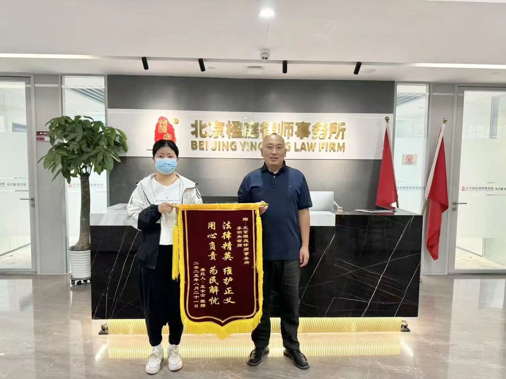 锦旗上金灿灿的大字:“法律精英、维护正义,用心负责、为民解忧”,不仅是对李明杰律师专业能力的最佳褒奖,更是楹庭律所“法之楹,信于庭”立所理念的生动体现。